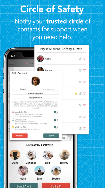 هشدارهای محرک سریع ثبت اختراع کیف پول ایمنی KATANA صفحه قفل تلفن شما را دور می زند تا به مرکز پاسخ اضطراری 24/7 ما اطلاع دهد. متخصصان آموزش دیده ما می توانند خدمات اضطراری را به محل دقیق GPS شما اعزام کرده و به خانواده و دوستان معتمد شما هشدار دهند.