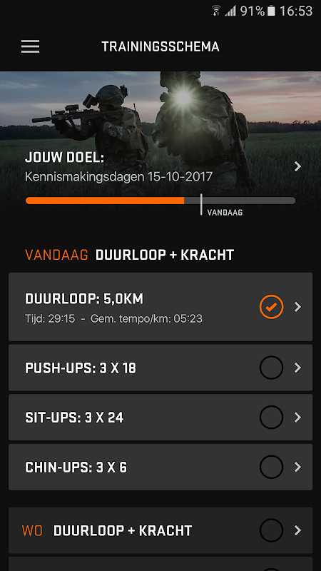 - inloggen met je Defensie-account, zodat je trainingsschema bewaard blijft;