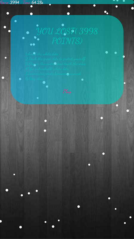 یک بازی معمولی، بکشید تا زندگی را حفظ کنید، نقاط سبز را لمس کنید تا محافظت شوید، نقاط سفید را لمس کنید تا شکست بخورید، هر دو طرف را لمس کنید تا شکست بخورید، حرکت برای گرفتن امتیاز، هر چه بیشتر زنده بمانید پیروزی است، بیایید و با هم بازی کنید!