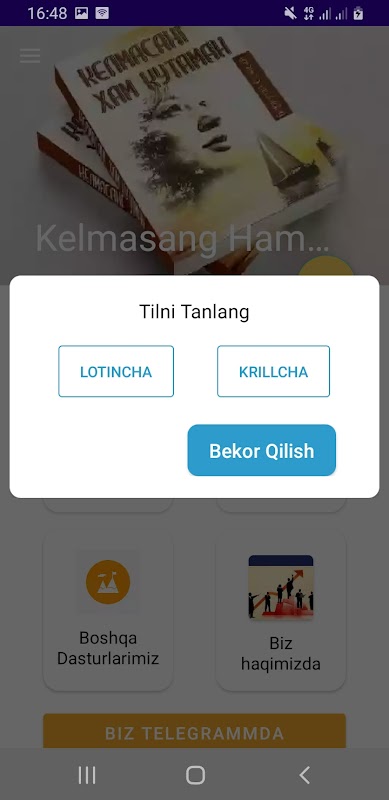 بیزنینگ عزیز کیتوبکسونلاریمیز اوچون ناوباتداگی آجوییب کیتوب. سیز اوشبو کیتوبدان اوقیر اکانسیز دونگیوگا بوشقاچا نیگوه بیلان قراشنی بوشلایزیز. اوزینگیز اوچون یانگیدان یانگی فیکرلارنی کشف قیلاسیز. سیز اوچون جودا فویدالی کیتوب. Oxirigacha o’qishni maslaxat beramiz. سیزلرگا اوغینا فویدامیز تککان بؤلسا بُندان بیز جودا خُرساندمیز. کیتوبلار اولامی یوزوویگا بوسیب بیزنینگ کوئپلاب بوشقا دستورلاریمیزنی یوکلاب اولیشینگیز ممکین.