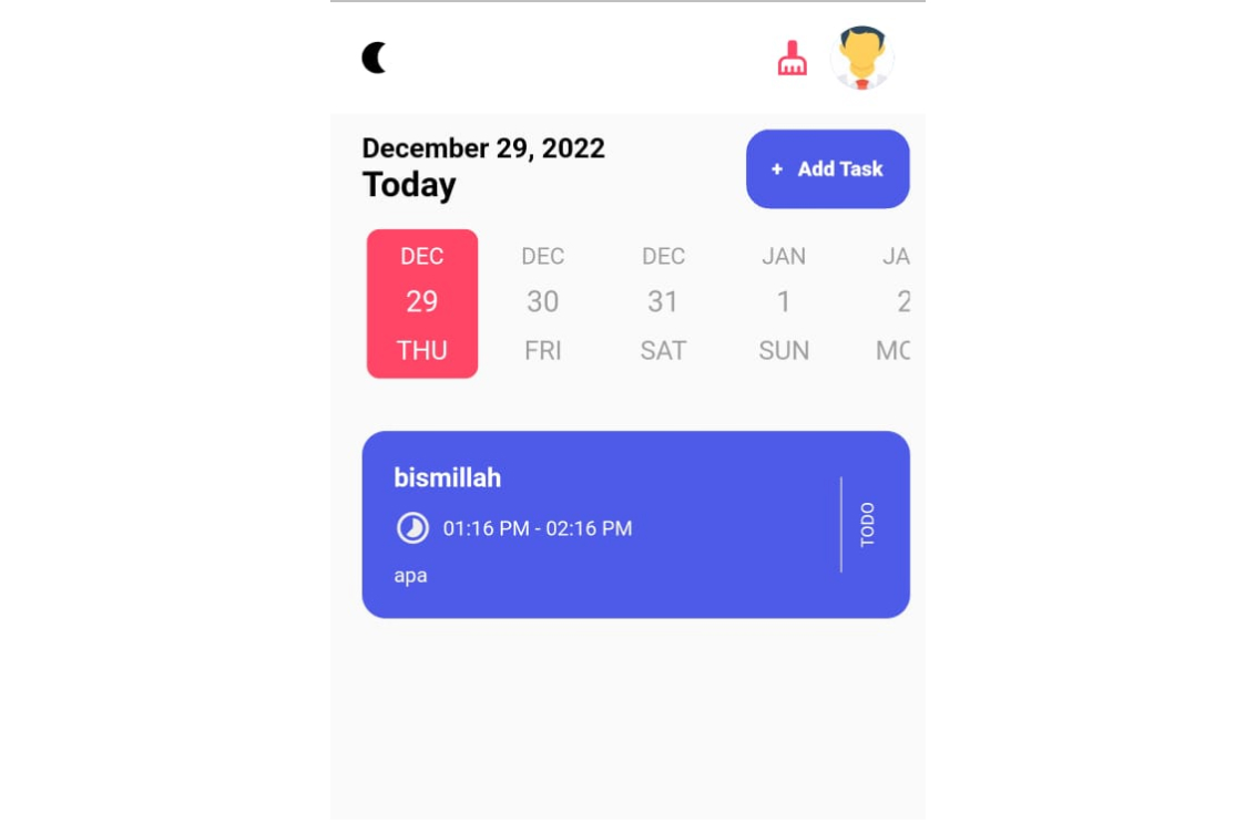 Applikasi untuk mengingatkan Task and pada keseharian dirancang menggunakan flutter dan dibuat untuk memenuhi tugas Ujian Akhir Semester Mata Kuliah Pengembangan Aplikasi Mobile Kelas B, Universitas Islam Sunan Gunung Djati Bandung dari Kelompok 1, Kelompokng