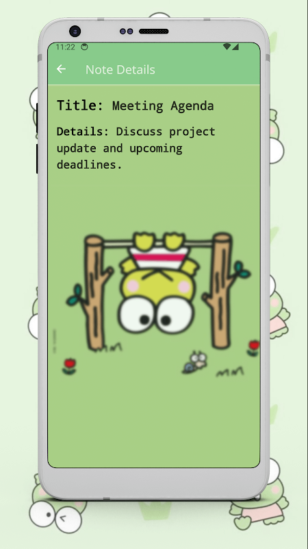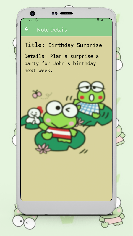 این برنامه با تصاویر لذت بخش Keroppi تزئین شده است و محیطی شاد و لذت بخش برای یادداشت برداری ایجاد می کند.
