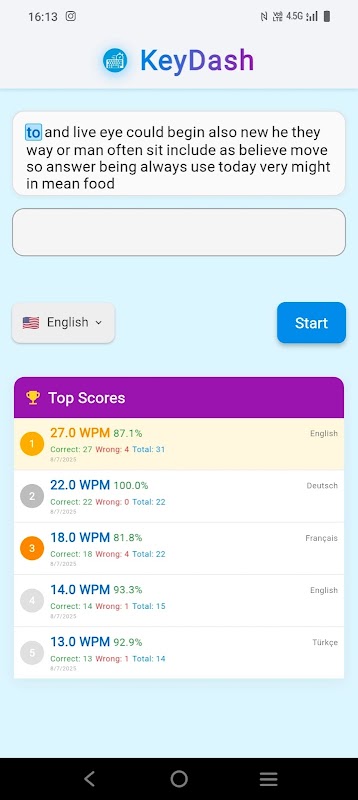 با استفاده از این برنامه تست صفحه کلید، می توانید سرعت تایپ خود را اندازه گیری کنید، عملکرد صفحه کلید خود را تجزیه و تحلیل کنید، و پیشرفت خود را پیگیری کنید. این برنامه به شما امکان می دهد هم سرعت ورودی و هم زمان پاسخگویی کلیدهای خود را آزمایش کنید.