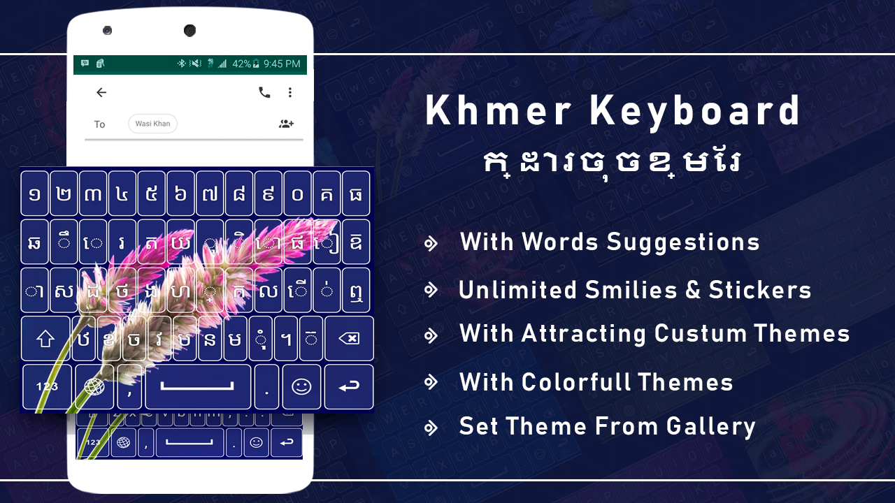 The new Khmer English Keyboard is the new way to use your default mobile keyboard with multiple colors, beautiful backgrounds, emoji keyboard for mobile and much more. This is best keyboard theme that likely compatible with android keyboard and best app to customize keyboard with new look. Download latest colorful theme keyboard with keyboard wallpaper to give change your phone look into a new way.