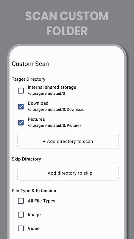 ❖ همه فایل ها را اسکن کنید یا به صورت انتخابی عکس ها، فیلم ها، صدا و اسناد را اسکن کنید