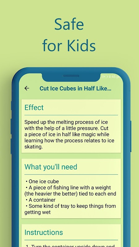 You’ll find a lot of experiments that could be done with simple ingredients that are easily available around your home (with adult supervision of course). Learn all the new physics concept with a step by step guided experiments with animation and instructions to explain you the science behind the experiments.