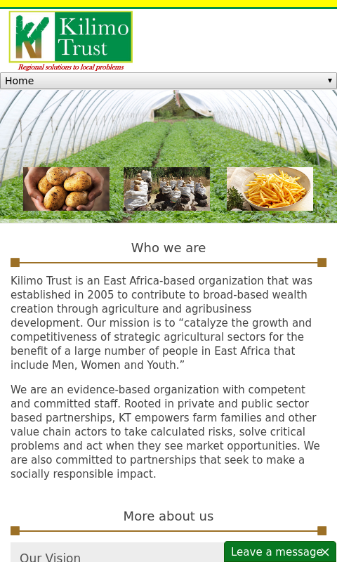Kilimo Trust is an East Africa-based organization that was established in 2005 to contribute to broad-based wealth creation through agriculture and agribusiness development. Our mission is to “catalyze the growth and competitiveness of strategic agricultural sectors for the benefit of a large number of people in East Africa that include Men, Women and Youth.”