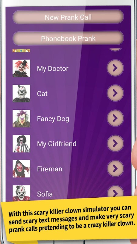 With this scary killer clown simulator you can send scary text messages and make very scary prank calls pretending to be a crazy killer clown. Like other prank call games, it is quite simple and easy to use and only takes a few seconds to have loads of fun. Use fake call id changer and select the scariest killer clown images that will terrify your friend when their phone rings. Use this prank calling app killer clown to scare your friends but also be creative! For example, send a killer clown prank text to a friend who forgot to do something or make call from killer clown prank telling them to do something for you. You will laugh out loud seeing your friends answer the phone with caution every time!