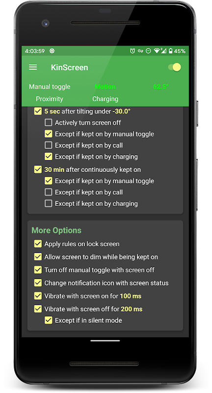 زمانی که هیچ عملکردی وجود ندارد که به طور فعال صفحه را روشن نگه میدارد، میتوانید مهلت زمانی نمایش را انتخاب کنید. اگر صفحه نمایش روشن نیست، برای صرفه جویی در مصرف باتری، زمان آن باید به سرعت تمام شود. هنگامی که سنسور مجاورت پوشیده شده باشد (در جیب یا رو به پایین)، یا زمانی که دستگاه به سمت پایین باشد، صفحه نمایش می تواند حتی سریعتر خاموش شود. همچنین میتوانید یک بازه زمانی جداگانه برای صفحه قفل تنظیم کنید. وقتی برنامههای دیگر صفحه را روشن نگه میدارند، KinScreen صفحهنمایش را خاموش نمیکند، مگر اینکه انتخاب کرده باشید که صفحه نمایش را فعال کنید.