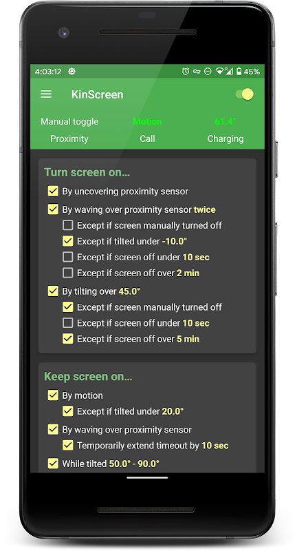 آیا متوجه میشوید که صفحهنمایش را برای خاموش کردن آن فشار میدهید؟ آیا می خواهید صفحه نمایش خود را بدون دکمه پاور روشن کنید؟ KinScreen هنگام استفاده از تلفن خود به طور خودکار صفحه نمایش شما را روشن نگه می دارد، اما وقتی نمی خواهید در مصرف باتری صرفه جویی کنید، آن را سریعتر خاموش می کند.