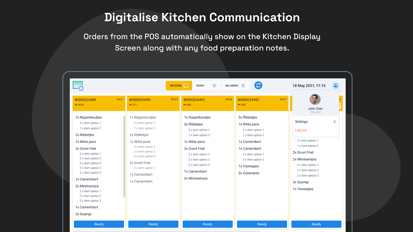 صفحه نمایش آشپزخانه (KDS) به کارکنان آشپزخانه و خدمات شما اجازه می دهد تا با سفارشات مشورت کرده و وضعیت سفارش را مطابق با مرحله آماده سازی غذا تغییر دهند.