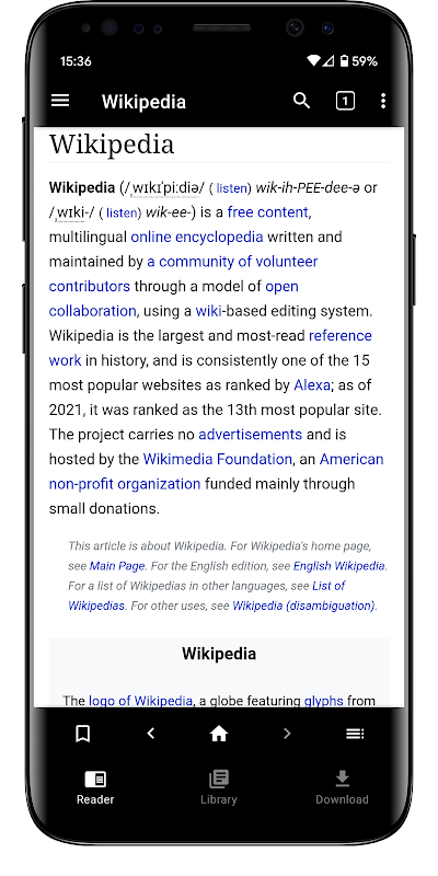 از ما حمایت کنید Kiwix یک غیر انتفاعی است و هیچ آگهی نمایش نمی دهد و هیچ داده ای را جمع آوری نمی کند. می توانید در اینجا کمک مالی کنید: https://kiwix.org/en/get-involved/#donate