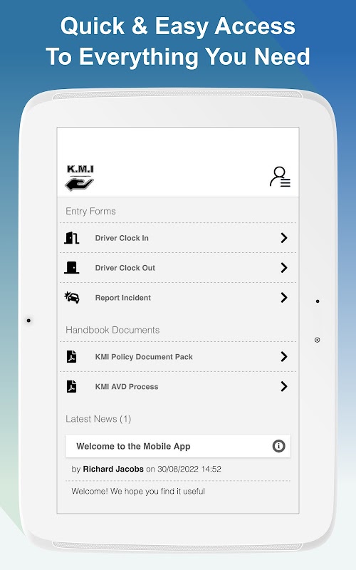 برنامه رسمی KMI Logistics رانندگان را قادر میسازد تا به صورتحسابهای خود دسترسی داشته باشند، اطلاعات شخصی خود را تغییر دهند، کتابهای دستی خود را مشاهده کنند، فرمهای روزانه مورد نیاز را ارسال کنند و بهروزرسانیها و اعلانها را از مدیران تعیینشده دریافت کنند.