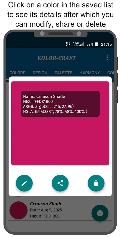 با تمام رنگ های ذخیره شده، گزینه مشاهده، اشتراک گذاری یا اصلاح با کلیک کردن و گزینه حذف با کلیک طولانی را دارید.