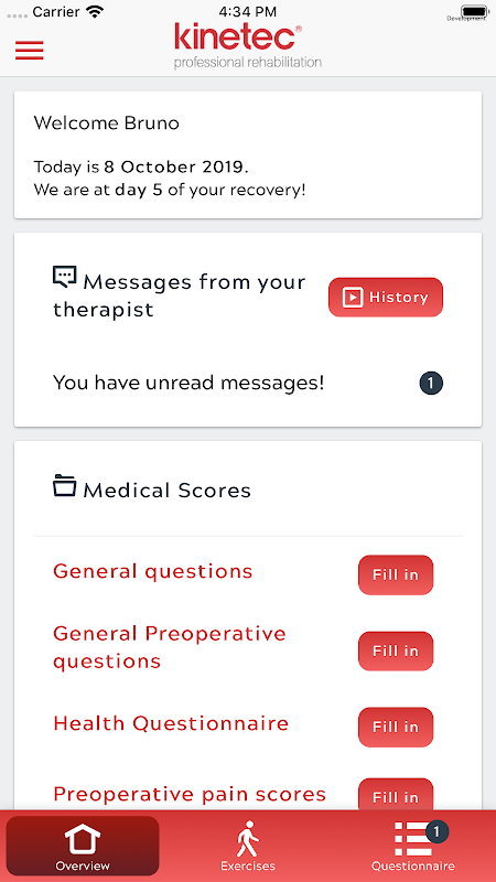 برنامه شما را در طول کل بازیابی ، از طریق فیلم آموزشی واضح و مشاوره در مورد استفاده از Kinetec ، شما را در خانه راهنمایی می کند. شما قادر خواهید بود پیشرفت خود را کنترل کنید و برنامه های خود را برای روزهای آینده مشاهده کنید. پزشک شما قادر به نظارت بر پیشرفت شما خواهد بود و در صورت نیاز پروتکل به روز شده را برای شما ارسال می کند.