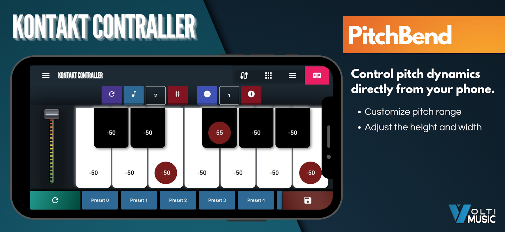 کنترل کننده هوشمند Kontakt به شما امکان می دهد از طریق تلفن همراه خود با رابط گرافیکی بصری صداهای بانکی خود را کنترل کنید ، ترانزیت کنید ، Octave و موارد دیگر را برای Kontakt (ابزار بومی) کنترل کنید.