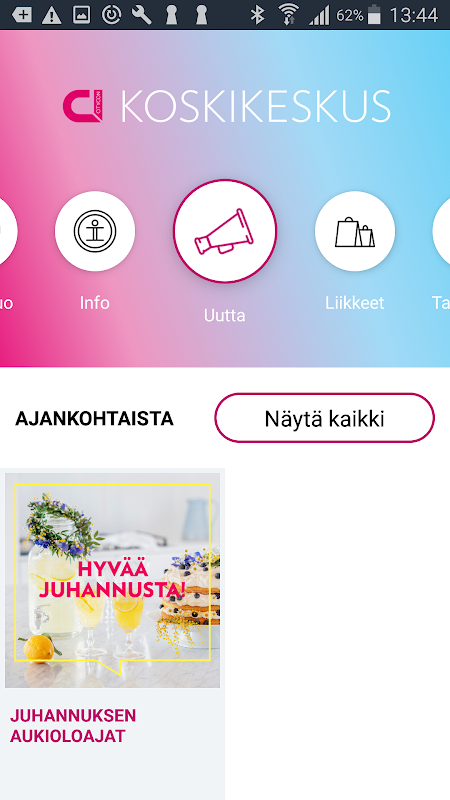 The Koskikeskus mobile service combines personal benefits with a real-time selection of stores and offers, as well as indoors guidance.