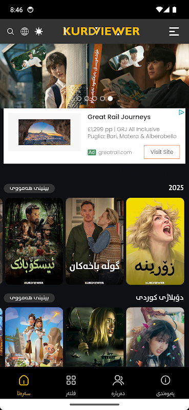- بە هەڵبژاردنی زمان (کوردی/ئینگلیزی) و مۆدی تاریک/ڕوون، دەتوانیت ماڵپەڕەکە بە سلیقەی خۆت ڕێکبخەیت.