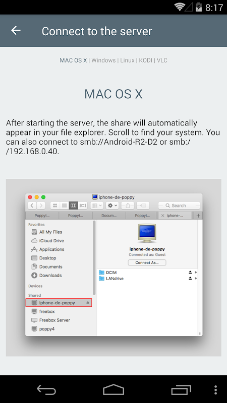* ذخیره سازی "خارجی" (عکس ها و فیلم ها) را در دستگاه خود به عنوان یک پوشه به اشتراک گذاشته شده شبکه دسترسی پیدا کنید.