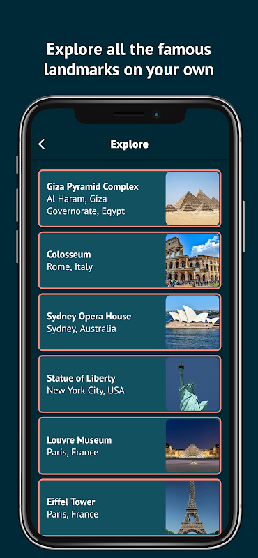 Landmark Quiz به شما کمک می کند تا در مورد مکان های دیدنی به روشی منحصر به فرد، ترکیبی از یادگیری و بازی یاد بگیرید. این سایت معروف ترین 100 مکان فرهنگی و طبیعی در جهان را با بیش از 900 سوال در 90+ سطح معرفی می کند، از جمله مجسمه آزادی، برج ایفل، کولوسئوم، دیوار بزرگ چین، ساگرادا فامیلیا، خانه اپرای سیدنی، مجتمع هرم جیزا، استون هنج، تاج محل، مسیح نجات دهنده، برج خلیفه، کوه اورست، ماچو پیچو، کوه فوجی، قلعه نویشوانشتاین، شارد، پترا و بسیاری دیگر.