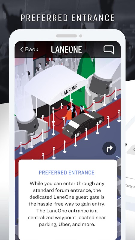 LaneOne has partnered with major venues to provide our customers a LaneOne preferred entrance to avoid the crowds regardless of whether you arrive early, late, or on-time. The app will show you where the entrance is at each venue.