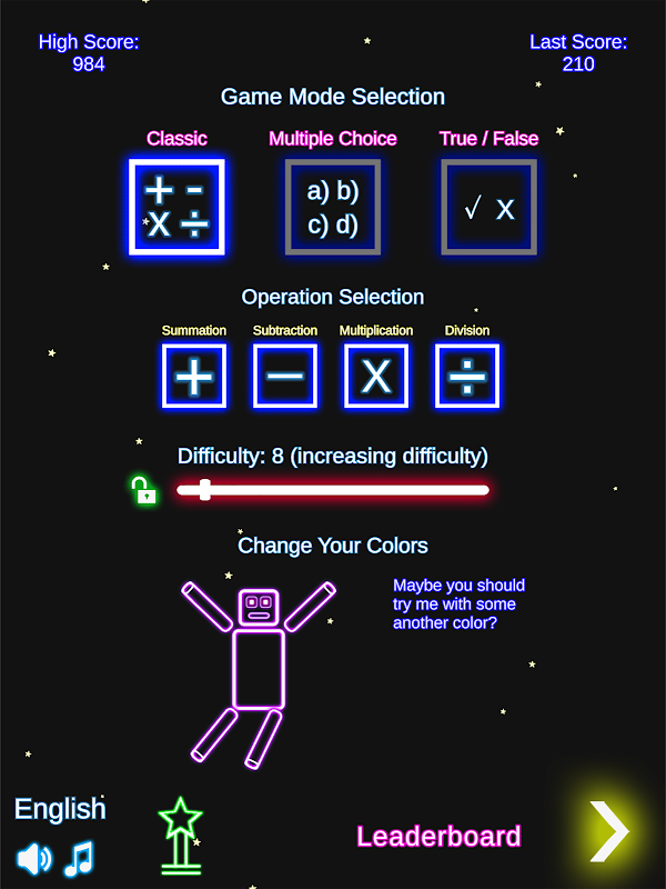 لیزر ریاضی ریاضی بازی برای بچه ها و بزرگسالان مناسب است. بالا انواع گزینه های دشواری برای تمام گروه های سنی در دسترس هستند. جمع و تفریق و ضرب و تقسیم در دسترس هستند و شما می توانید آنها را انتخاب کنید. اگر شما نمی خواهید برای دیدن سوالات تفریق شما می توانید غیر فعال کردن. این است پاپ بازی برای عملیات چهار پایه ریاضی. گیم پلی: محافظت از نئون انسان را از افتادن به لیزر قرمز. نئون مرد می تواند زمان ذوب، اما نگرانی او جاودانه است! هر زمان که او به اندازه کافی ذوب, او بازسازی بدن خود را. پاسخ سوالات ریاضی به درستی، و نئون مرد خواهد شد پرش در سیستم عامل. حالت های بازی: - جمع - تفریق - ضرب - تقسیم - و ترکیب آنها (به عنوان مثال: انتخاب جمع و تقسیم تنها، و غیره.) مشکل: 100 سطح را با دشواری های بی پایان شروع. اگر شما نمی خواهید به دشواری افزایش، شما می توانید آن را قفل! سفارشی: اگر می خواهید مرد نئون شما بدن خود را از 1.000.000 ترکیب رنگ رنگ می تواند. مدرسه ابتدایی دانش آموزان کلاس 1 درجه 2 درجه 3، کلاس 4th، 5 نمره همه می تواند لذت بردن از آن. این بازی برای همه است!