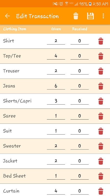 - را وارد کنید مقدار از هر نوع لباس داده شده به فرد لباس های شسته شده خود را