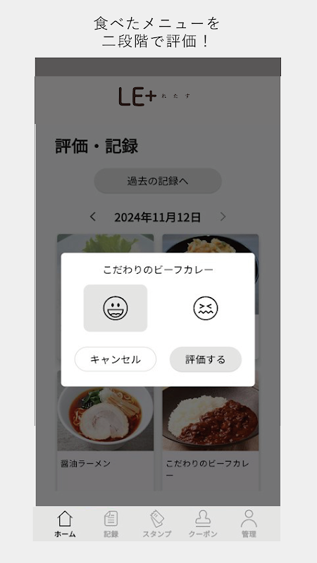 食べたメニューをタップして二段階の評価をすると、食事記録としてログが残ります。