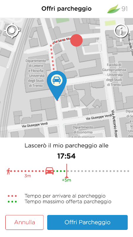 Prima di arrivare con la macchina a Trento puoi quindi controllare il livello di occupazione dei vari parcheggi in struttura, oltre a poter prenotare i parcheggi in strada offerti da altri utenti Leafbay.