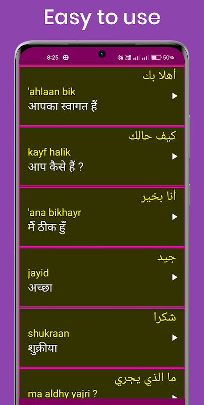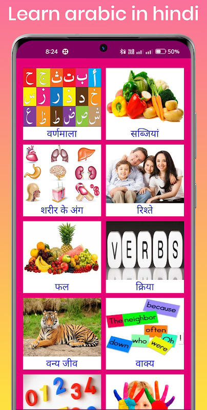 2. هر کلمه عربی دارای یک تصویر واضح و تلفظ صوتی است تا یادگیری عربی از طریق هندی را آسان کند.