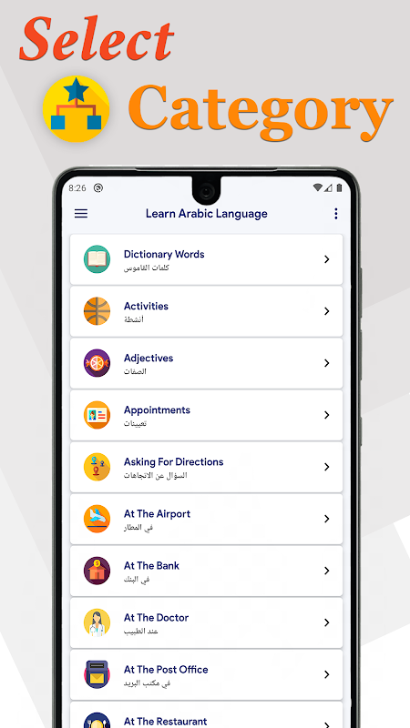 به راحتی عبارات مورد نظر خود را از طریق دسته بندی های سازمان یافته برنامه پیدا کنید. به عنوان مثال، اگر میخواهید بدانید که پزشک امروز در کجا قرار دارد، دستهبندی «در پزشک» را بررسی کنید تا عبارات مرتبط درباره پزشکان را بیابید. این رویکرد ساختاریافته یادگیری عبارات خاص و کاربردی عربی را بدون دردسر می کند.