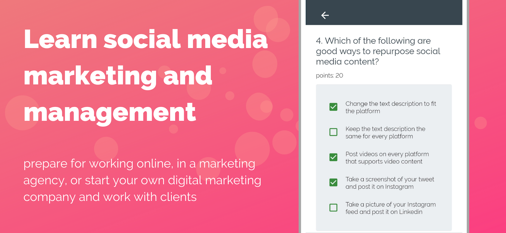 در مرحله بعد، بازاریابی رسانه های اجتماعی را پوشش می دهیم. ما می دانیم که بازاریابی رسانه های اجتماعی چقدر مهم است. ما تمام شبکه های اجتماعی، اینستاگرام، فیس بوک، توییتر، لینکدین، پینترست، اسنپ چت، تیک تاک را پوشش می دهیم. شما یاد خواهید گرفت که چگونه پایگاه های فالوور بزرگ بسازید و آنها را به صورت ارگانیک و تبلیغاتی درگیر کنید.