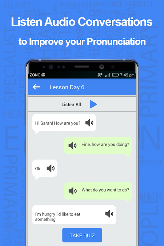 English Speaking and Learning app is a offline course designed to enhance your English language learning capabilities. It is a blend of scientific language learning tactic with listening capability of Urdu Speaking learners who want to learn English Language. We want them to listen English language learning phrases of daily life & then by listening those offline conversations and their comprehension they will be able to relate situation, happening & objects with English Language communication.