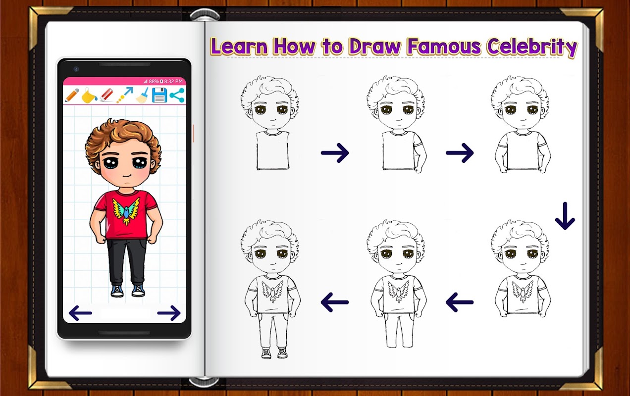 Learn How to Draw Chibi Famous Celebrity Characters is a fast and simple step by step guide for drawing your favorite cute celebrities from famous shows, videos, music and moivies. Its step by step instructions improve creativity and confidence in your young ones while drawing their favorite famous celebrities.