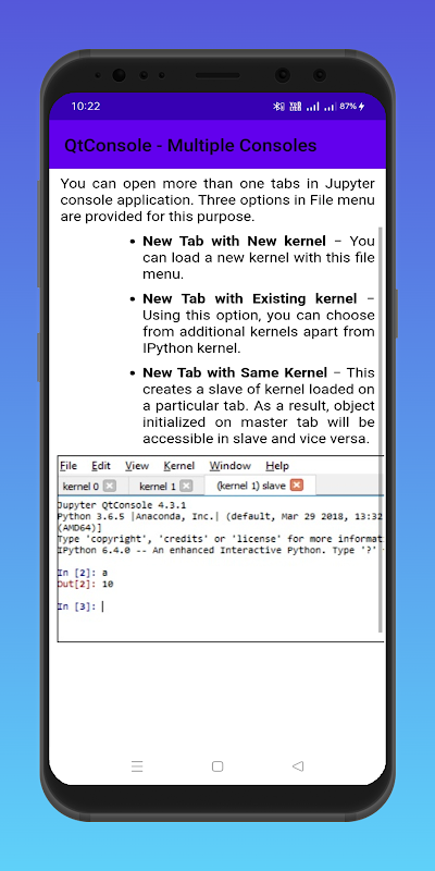 Project Jupyter is a comprehensive software suite for interactive computing, that includes various packages such as Jupyter Notebook, QtConsole, nbviewer, JupyterLab. This app gives you an exhaustive knowledge on Project Jupyter. By the end of this app, you will be able to apply its concepts into your software coding.
