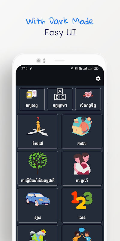 برنامه یادگیری خمر برای مبتدیان دارای 27 بخش مختلف است. آنها عبارتند از ~ مدرسه، کار، حیوانات، ورزش، مصاحبه، بازجویی، جملات مکرر، هتل، تاریخ، مشکلات، رستوران، ماشین، رنگ ها، اعداد، پزشک، مسیرها، حمل و نقل، بدن، زمان، احساسات، بازار، سفر و طبیعت، معرفی، آب و هوا، طالع بینی، سلام و خرید. دسته بندی ها برای اکثر جملاتی که باید در این موقعیت ها و مکان ها یاد بگیرید کافی است.