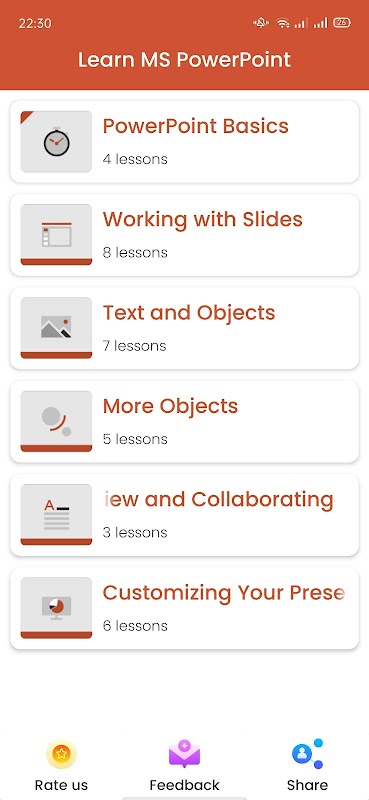 Learn MS PowerPoint شما را با یک درس بسیار مفصل آشنا می کند ، در زیر محتوا و ویژگی های برنامه ذکر شده است: