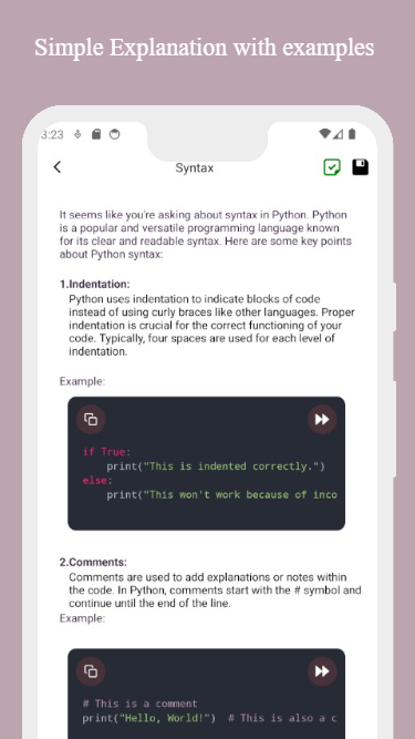 3. کامپایلر ساده پایتون: برنامه نویسی را در حین حرکت تمرین کنید! کامپایلر داخلی پایتون ما به شما امکان می دهد کد خود را مستقیماً در برنامه بنویسید، آزمایش کنید و اجرا کنید. بدون نیاز به جابجایی بین پلتفرم های مختلف.