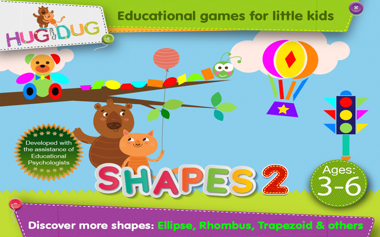 Your child will learn to recognize shapes in their real-life context. Shapes like trapezoid, ellipse and diamond in addition to the shapes learned on HugDug shapes 1.