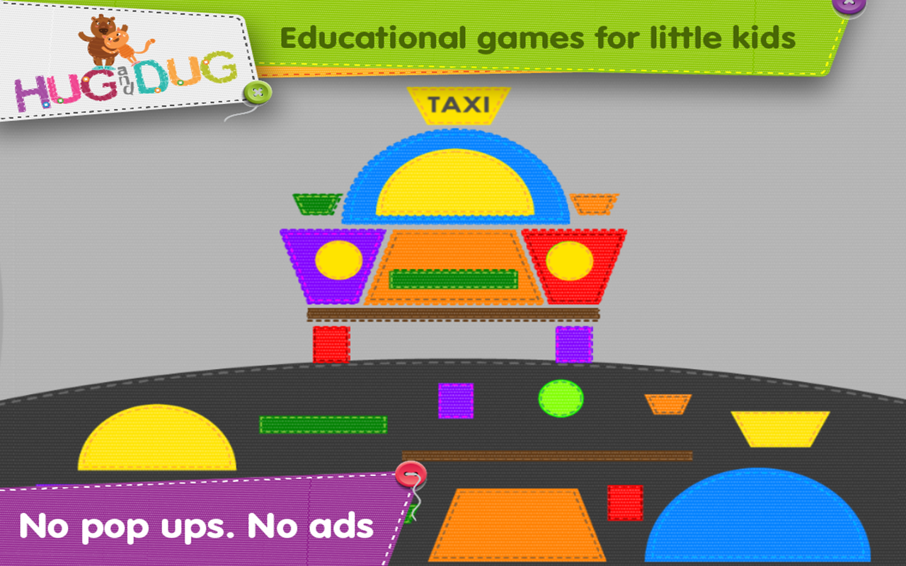 By matching shapes and colors, kids create real animated puzzles. Fly the air balloon, take a journey underwater with the submarine or build a house for Hug and Dug.