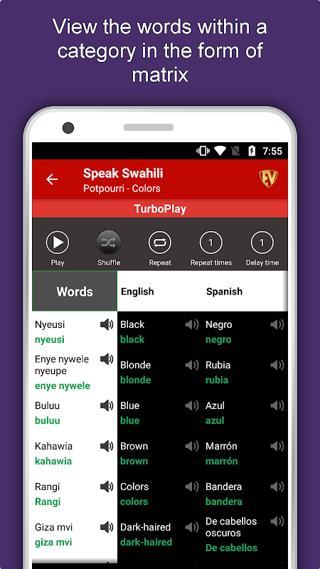 برنامه آموزش زبان سواحیلی آنلاین است 2135 کلمات با 55 دسته. این شامل تلفظ، تصاویر و فونتیک کلمات برای یادگیری آسان است. تغییر زبان پایه، ذخیره آموخته در EduBank℠، بازی های صوتی، عطر گل ها و بازی های حفظ ویژگی های اصلی صحبت سواحیلی برنامه می باشد.