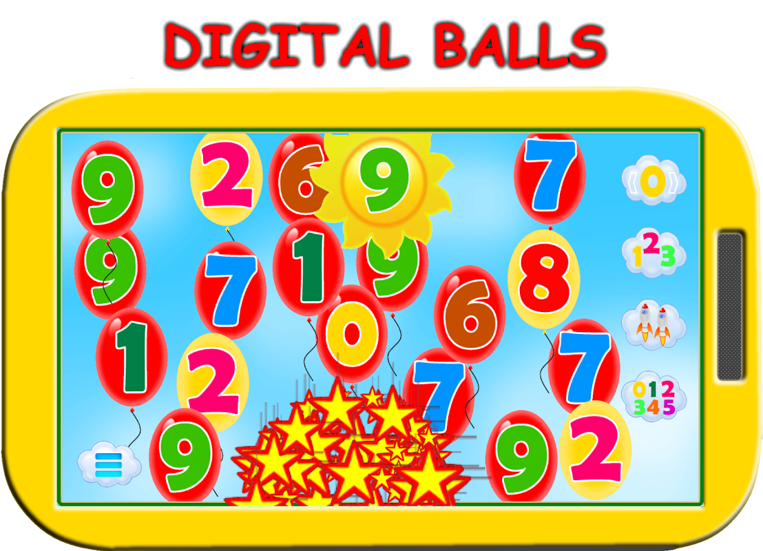 This game is for finding the studied numbers in game form. Balls with numbers appear on the screen and the task is given - a number that is pronounced and written in the middle of the screen in the sun. The child needs to find the required number on the ball and click on it, the ball will burst. The task is considered completed after the 7 balls have burst. After this task the number changes and new balls with mixed numbers are given. Every time the numbers change randomly.
