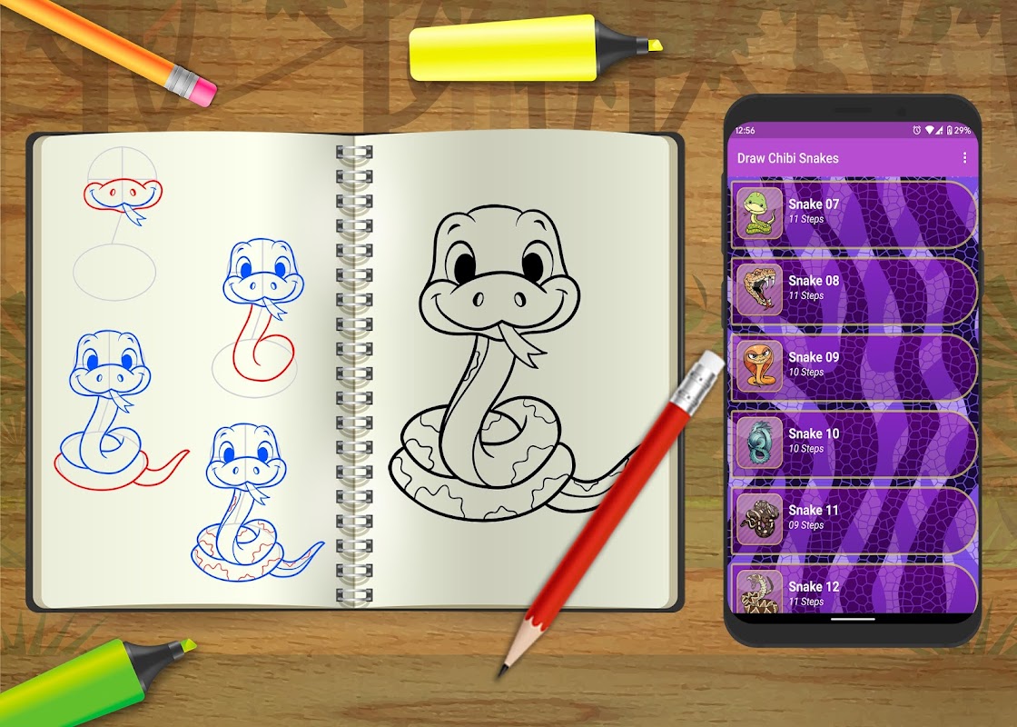 Learn how to draw cute chibi snakes is an app that provides a large collection of snake drawings including: Learn to draw King Cobra, Draw Cobra snake, how to draw Realistic Snake, how to draw cute baby snakes, snake drawing tutorial for beginners, Learn to draw snake head tattoo, Tribal Snake, Cartoon Snake, Snake Tattoo, Draw Snake Heads, Anaconda, Snake Love, Black Mamba, Viper and many more easy snake drawing tutorials.
