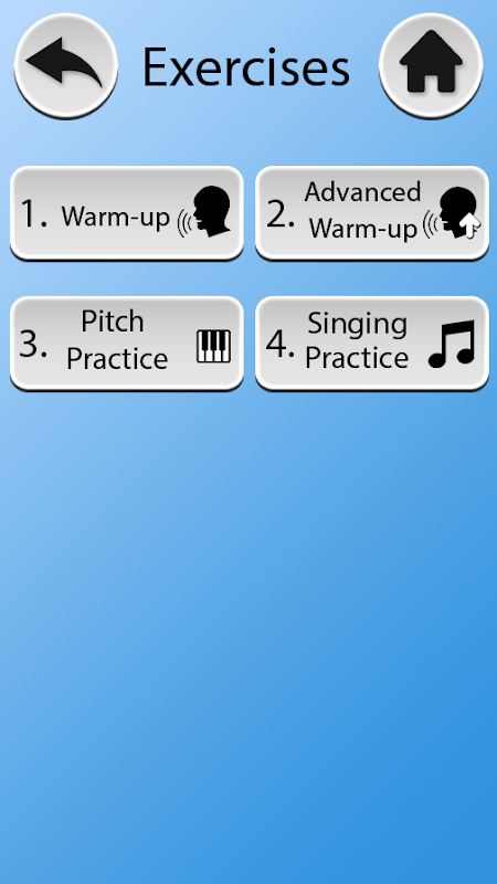 The app is split between Lessons and Exercises, for Beginner and Intermediate and even Advanced singers.