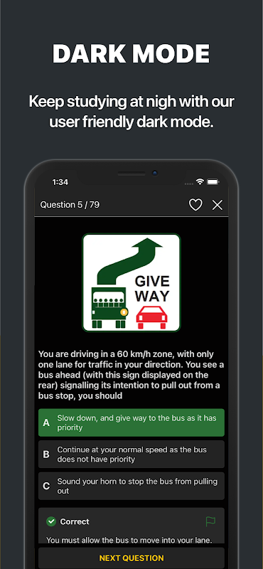 برنامه ما همان شرایط آزمون واقعی را که در مرکز آزمون زبانآموزان VicRoads با آن مواجه خواهید شد، شبیهسازی میکند. شما 45 سوال با 3 پیشنهاد دریافت خواهید کرد. شما به حداقل 41 پاسخ صحیح نیاز دارید (با حداقل 12/15 در سوالات دانش عمومی و 29/30 در سوالات ایمنی جاده). مطمئن باشید که با برنامه ما گواهینامه رانندگی خود را دریافت خواهید کرد.