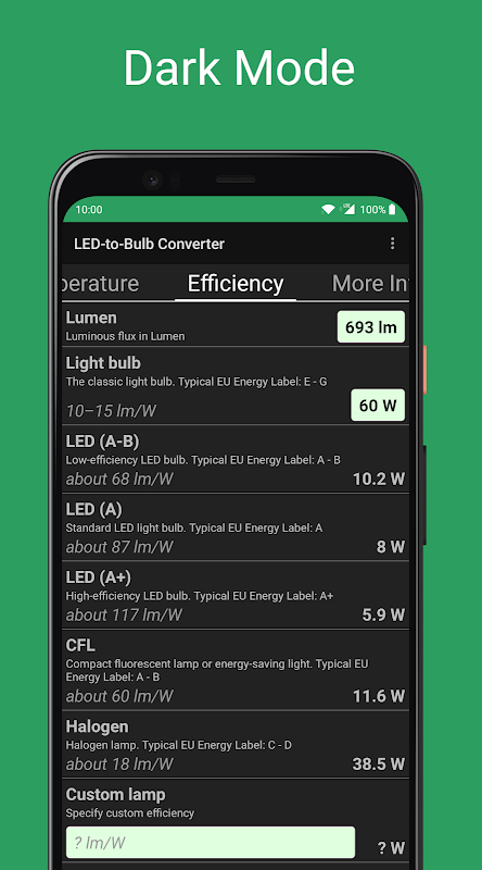 LED-to-Bulb Converter یک برنامه رایگان است که مقادیر وات لامپهای LED ، لامپها ، لامپهای کم مصرف فلورسنت (لامپهای کم مصرف) و لامپهای هالوژن و روشنایی متناظر آنها را در Lumen (lm) مقایسه می کند. این برنامه به شما کمک می کند تا لامپهای جدید LED یا کم مصرف را انتخاب کنید که تقریباً به اندازه لامپ خوب قدیمی هستند.