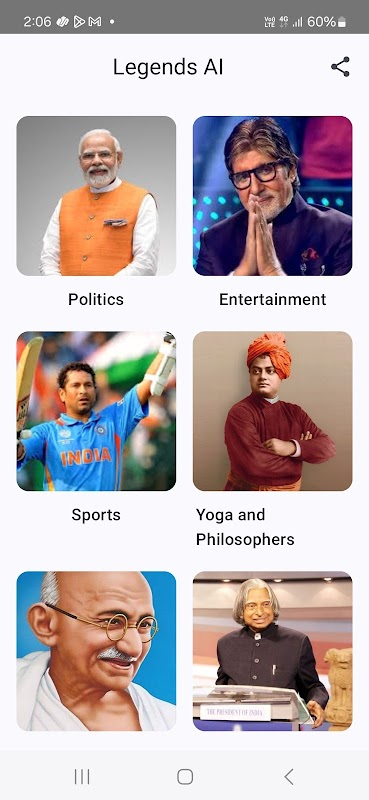 LegendsAI یک برنامه اندرویدی مبتکرانه مبتنی بر هوش مصنوعی است که به شما امکان می دهد با شخصیت های نمادین هندی کاوش و کشف کنید - از دانشمندان افسانه ای و کارآفرینان رویایی گرفته تا سیاستمداران با نفوذ، افراد ورزشی، بازیگران، مبارزان آزادی و اصلاح طلبان اجتماعی.