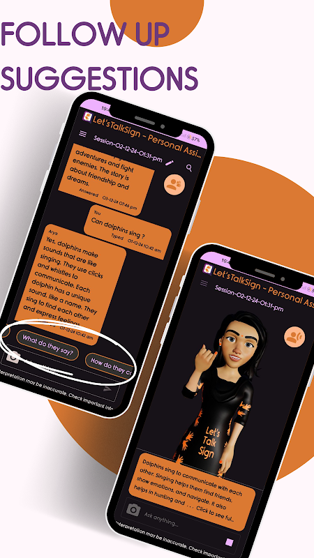 Let'sTalkSign «دستیار شخصی» یک برنامه مبتنی بر هوش مصنوعی است که برای جامعه ناشنوایان طراحی شده است. پاسخ سوالات خود را به زبان اشاره هندی (ISL) دریافت کنید و شیوه ای انقلابی از تعامل با جهان را تجربه کنید. از تجزیه و تحلیل عکسها تا کشف نام علامت منحصر به فرد شما، این برنامه به کاربران ناشنوا و علاقهمندان به زبان اشاره قدرت میدهد مانند قبل!