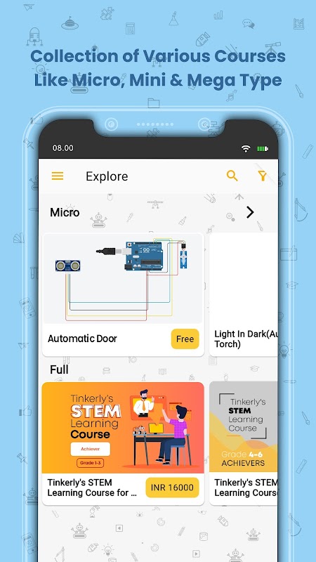بخش کاوش در برنامه Let's Tinker شامل دوره های کوتاه و رایگان قابل تنظیم برنامه نویسی برای دانش آموزان است که به 3 دسته تقسیم می شوند - دوره های Micro، Mini، و Full.