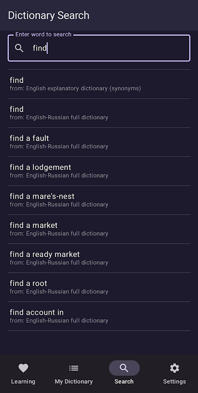 🌐 Integrated Web Search: Instantly look up words in Google Translate directly from the search screen for extended definitions and usage examples.